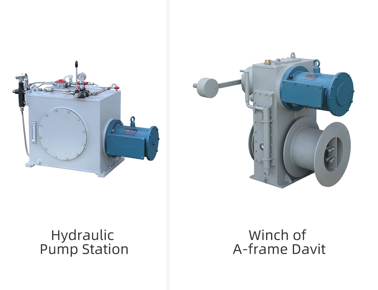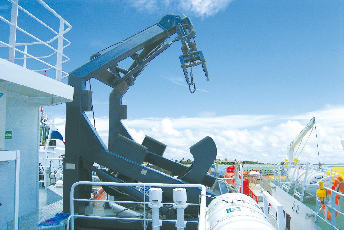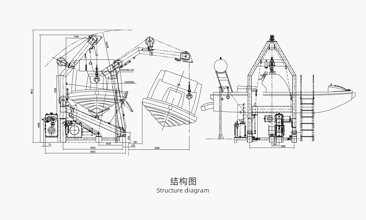 本装置的设计、制造和试验完全符合1974年国际海上人命安全公约及其修正案第Ⅲ章第4、34条;经MSC.226(82)和MSC.427(98)修正的MSC.81(70)《经修正的就生设备试验建议》第1部分和第2部分;经MSC.218(82)和MSC.425(98)修正的MSC.48(66)《国际救生设备规则》第I、VI章的要求。 本装置为液压驱动倒出下降的吊艇架,在紧急情况下可通过蓄能器实现吊艇架倒出动作。且艇上船员可通过遥控的方式下放救助艇。失电情况下可通过手摇泵提供液压驱动,实现救助艇下放动作。本装置配套的电动/液压绞车可用于回收载员6人的救助艇。