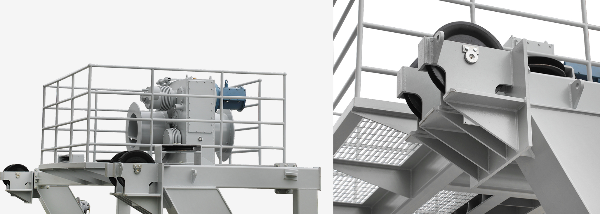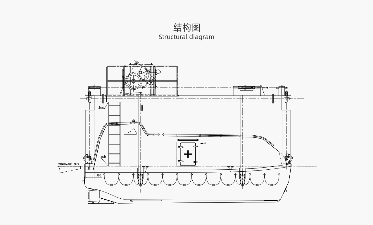 本装置的设计、制造和试验完全符合1974年国际海上人命安全公约及其修正案第Ⅲ章第4、34条;经MSC.216(82)、MSC.425(98)要求,以及MSC.48(66)《国际救生设备规则》及其修正案MSC.218(82)、MSC.427(98)和CCS《浅海固定平台建造与检验规范》及IMO《2009年海上移动式钻井平台构造和设备规则》。 本平台吊艇架是安装在近海钻机上的一种专用救生装备,同绞车配套用于近海逃生和救生,本装置具有足够的强度和刚性来可靠的通过重力下放、电动和手动回收救生艇。操作人员能够观察到整个在下放和回收的过程。紧急情况下,所有人员能够全部登上救生艇并通过拉动艇内的遥控装置使得救生艇快速的下放至水面逃生。通过遥控器,船员可以在艇内通过与制动臂和小滚筒上的线轴连接的导线释放和停止绞车的手刹。船员也可以在甲板上操作手刹。