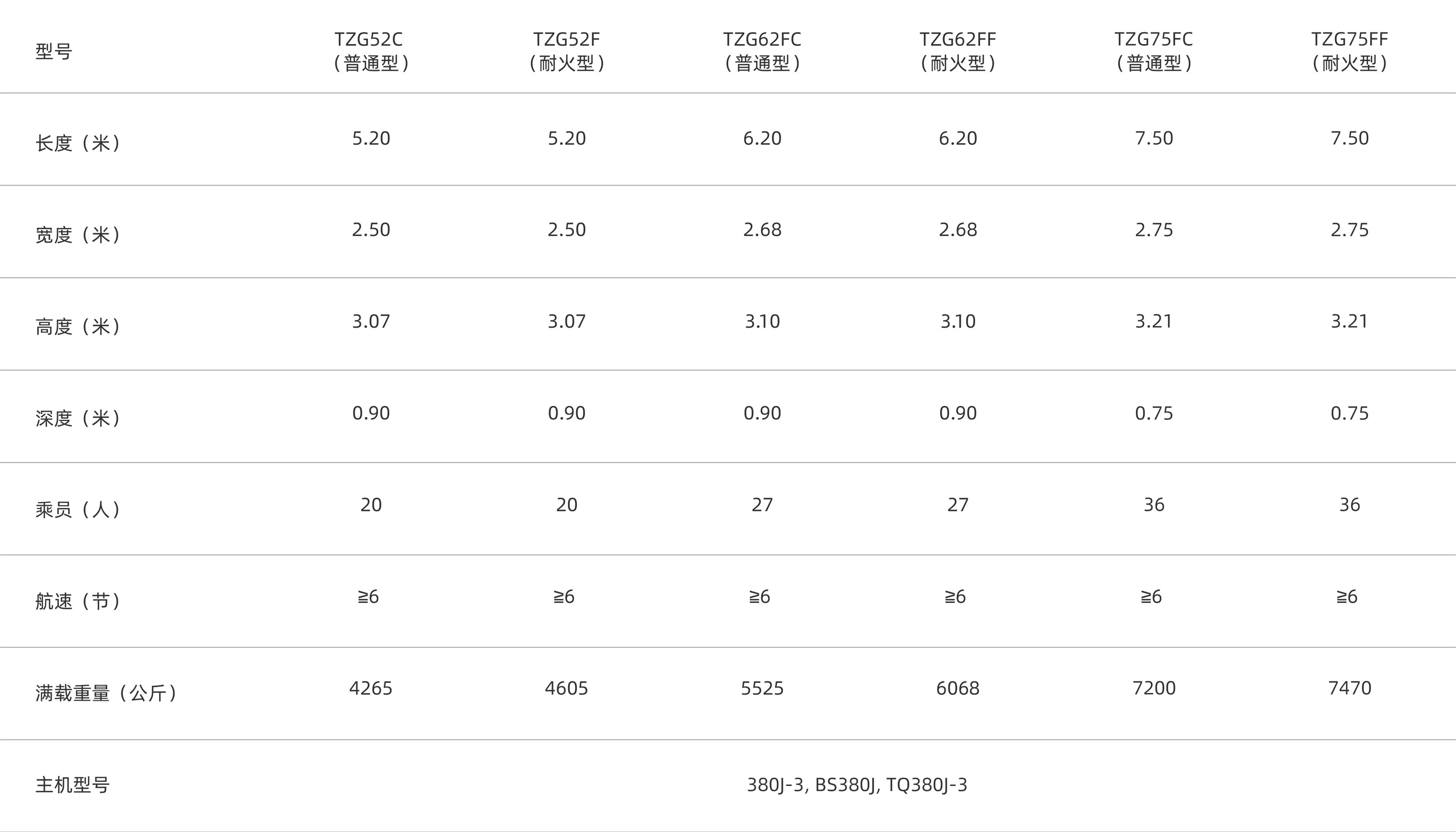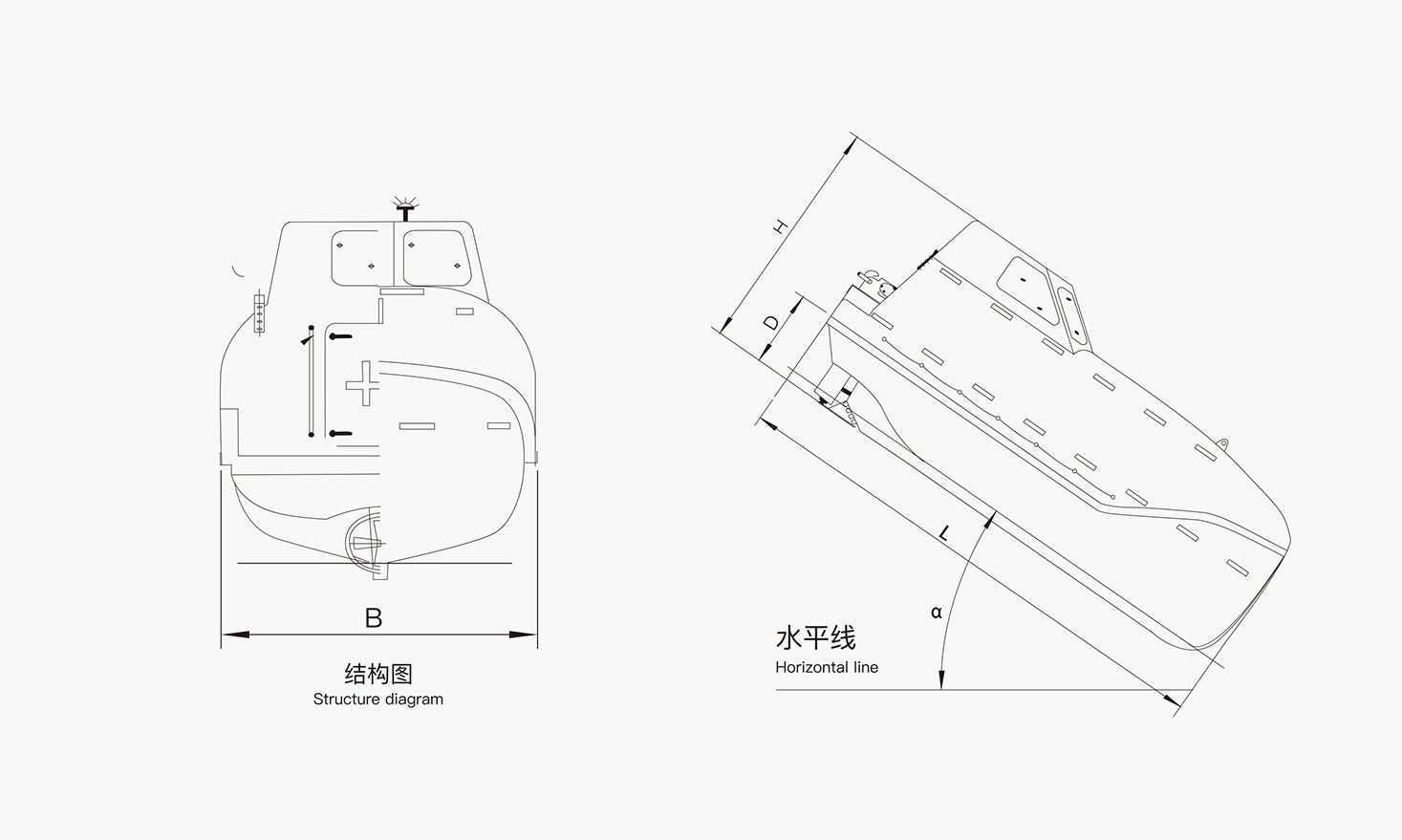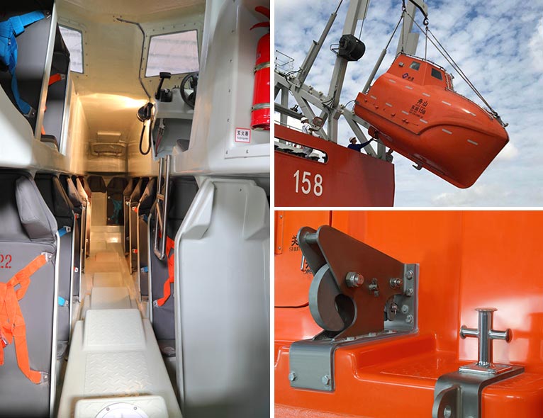 本艇的设计、制造和试验完全符合经MSC.226(82)、MSC.274(85)和MSC.323(89)修正的MSC.81(70)《经修正的就生设备试验建议》第1部分;1974年国际海上人命安全公约及其修正案第Ⅲ章第21、31、34条;经MSC.218(82)、MSC.272(85)修正的MSC.48(66)《国际救生设备规则》第Ⅳ章的要求;具备救生、救助兼用功能,适合在较恶劣海况下使用,如远洋客货轮及油轮等,同时也适用于石油钻井平台、军舰平台等。 艇体为具有高耐燃特性的阻燃型玻璃钢;供人员行走的表面均为防滑面;艇内装有可排除艇内积水手摇泵;本艇通过滑道自由降落下放,并采用吊艇索回收,自由释放系统装置是经过特殊设计的,操作方便、安全可靠;本艇可满载全速航行大于24小时,航速可达到6节。 本艇有普通型和耐火型两种规格,其中耐火型救生艇装有洒水系统,由主机水泵带动从艇最低处抽取海水,确保没有易燃液体进入系统,洒水系统能提供足够的水,喷洒于艇的表面;耐火型救生艇装有供气系统,可提供足够的的空气满足全体乘员和柴油机全速运转至少8分钟,能在艇内形成一个超压状态以阻止有毒有害气体的进入。